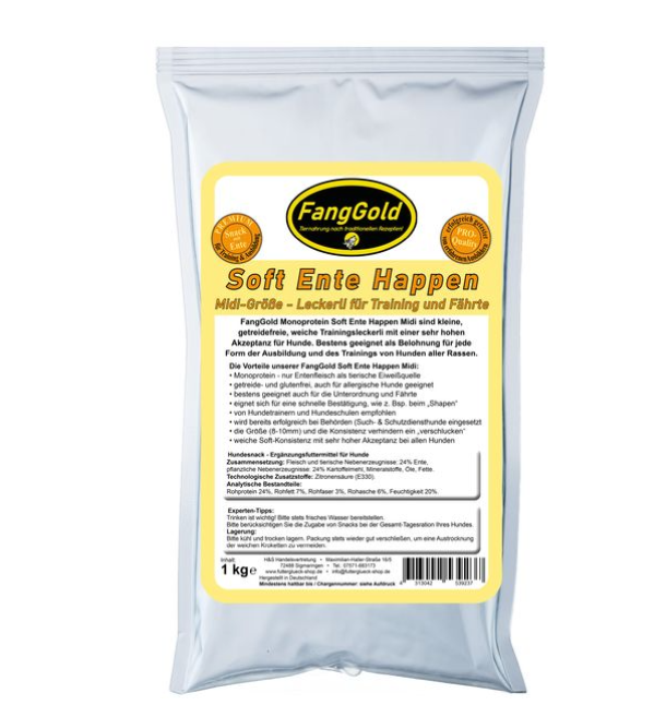 Durch ihre optimale Grösse von ca. 8–10mm und die weiche Soft-Konsistenz sind die Happen schnell fressbar und perfekt für eine unmittelbare Belohnung im Training. Ob Unterordnung, Fährte, Shapen oder Hundesport – die FangGold Soft Ente Happen Midi sorgen für eine schnelle Bestätigung ohne lange Kauzeit.